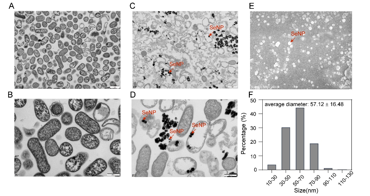 图1 亚硒酸盐胁迫下,Erwinia sp. PSI-03合成硒纳米颗粒的透射电子显微镜与扫描电子显微镜观察