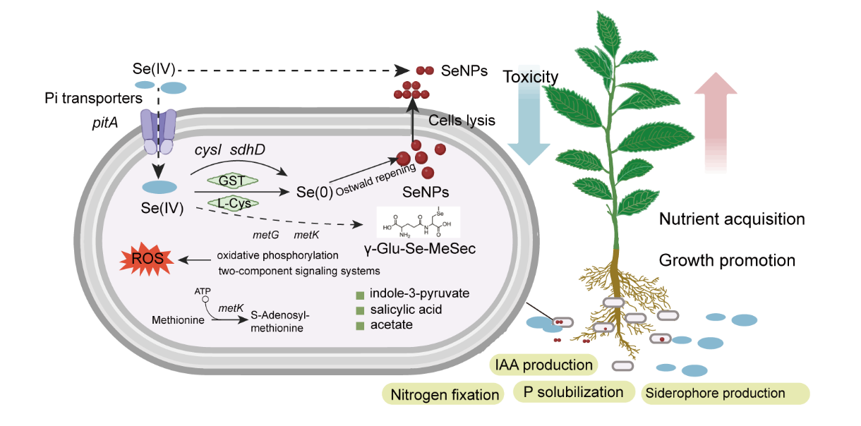 硒作为人体必需元素,其全球分布不均导致缺乏与污染并存。硒的生物利用度与毒性取决于化学形态:亚硒酸盐等有毒形态虽可用于农业生物强化,却易引发植物毒性及生态风险。微生物合成硒纳米颗粒为硒的安全利用提供了新途径;植物内生菌凭借其共生特性,在促进植物生长与硒形态转化方面展现出显著潜力。然而,目前关于硒氧阴离子在植物内生细菌中的转化机制尚不明确,这制约了其在农业生物强化与生态修复中的有效应用。