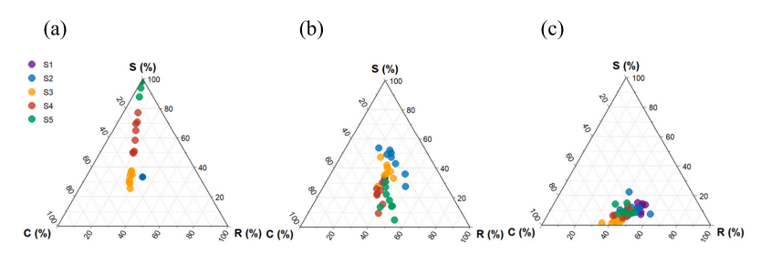 图4.乔木、灌木、草本层CSR生态策略在亚高山森林演替中的变化