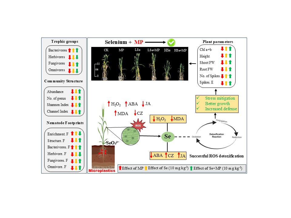 微塑料(MP)作为土壤生态系统的新兴污染物,可通过破坏土壤理化性质、降低生物多样性、抑制植物生理功能等途径,威胁农田生态系统健康、作物生产力及食品安全。尽管针对这种新型污染物对土壤线虫及植物的有害影响已有广泛的研究,但关于如何减轻MP造成的损害的研究仍较为有限。线虫广泛分布于土壤、淡水、海水及动植物体内,线虫在生态系统中通过摄食微生物调节分解过程,促进土壤有机质分解和养分循环,同时作为其他较大动物的基本食物来源,在生态系统的食物链中占据重要地位,被誉为土壤碳氮循环的隐形操控者,对稳定作物生产力具有重要作用。硒(Selenium, Se)作为动植物必需的微量元素,虽被证实能通过调节植物光合作用、抗氧化系统及激素信号通路来缓解植物地上部分的非生物胁迫,但关于其在缓解微塑料诱导的植物损伤及其在土壤-植物互作中的潜在作用,特别是对土壤线虫这一关键生物类群的调控机制,目前仍知之甚少。