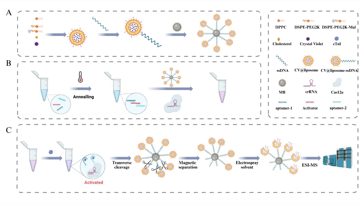 该技术的工作原理如下:首先,利用cTnI特异性适配体构建“锁定-激活”探针。当目标蛋白cTnI存在时,触发激活链的释放,进而激活Cas12a核酸酶的反式切割活性(第一重酶学放大)。随后,被激活的Cas12a切割连接在磁珠上的单链DNA(ssDNA)连接子,导致锚定在磁珠表面的信号脂质体脱落。这些脂质体纳米容器内部预装载了数以万计的质谱报告标签(CV),在电喷雾溶剂的作用下,脂质体破裂并瞬间释放出大量报告分子,从而实现信号的放大(第二重物理放大)。
