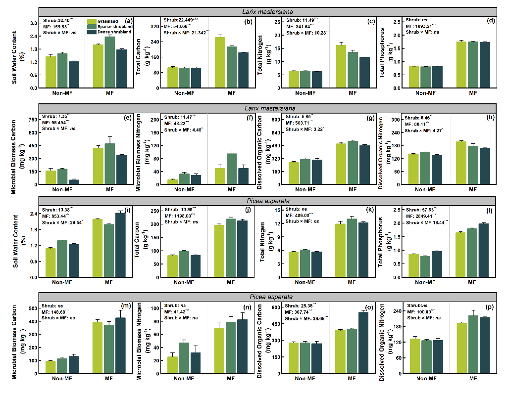 中国西南地区亚高山森林自20世纪50年代起遭受大规模砍伐,从1998年后经长期封山育林后,形成了大面积的次生灌丛(以四川米亚罗地区为例,次生灌丛面积占比已达27.4%)。作为森林演替的关键阶段,灌丛对下层植物幼苗的影响存在正反双重效应:一方面,灌丛可通过遮荫降温、缓冲极端温度等方式改善微环境,为树种更新提供“抚育作用”;另一方面,灌丛也可能通过与目标树种竞争光照、水分和养分而产生抑制作用。然而,在高寒生境限制与建群种种源缺失的双重制约下,建群种幼苗死亡率高,灌丛向以针叶林为建群种的顶级群落自然恢复需要数十年甚至上百年。该区域土壤存在养分释放缓慢、微生物活性不足等问题,进一步加剧了幼苗定居困难。针对上述限制因素,利用本地枯枝落叶中的功能微生物制成菌肥,成为一种潜在的人工干预措施。如何推动退化亚高山森林快速更新,成为亟待解决的科学问题。