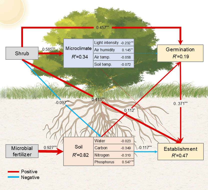 研究发现:(1)灌丛对建群树种早期生活史的促进效应显著,且密灌丛效果优于疏灌丛。相比草地,密灌丛中两种树种萌发率、初期存活率、定植率分别平均提升21%、59.29%和35.97%。(2)密灌丛通过降低光照强度、增加空气湿度,为种子萌发和幼苗生长创造了更温和的微环境。(3)值得注意的是,尽管微生物肥料通过改善土壤理化性质促进了种子萌发,但对幼苗定居产生了间接抑制作用。(4)结构方程模型进一步揭示,不同密度灌丛的促进效应独立于已监测的微气候和土壤理化因子,提示可能存在其他未明确的作用途径(如土壤微生物群落或菌根网络)。