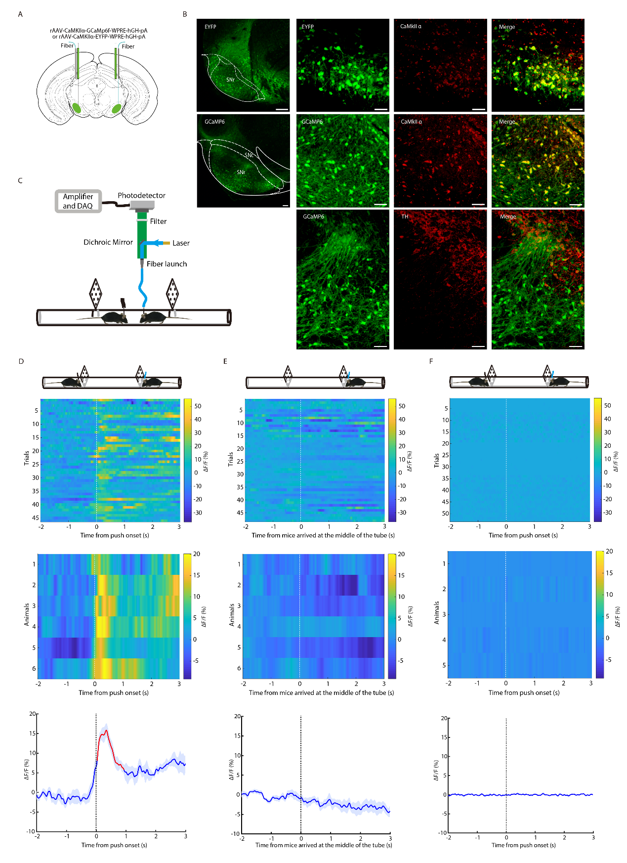 图1. SNrGlu神经元在钻管测试中表现出显著激活模式(D)、小鼠独自穿过测试管(E)和EYFP小鼠在钻管测试中(F)均无类似激活。