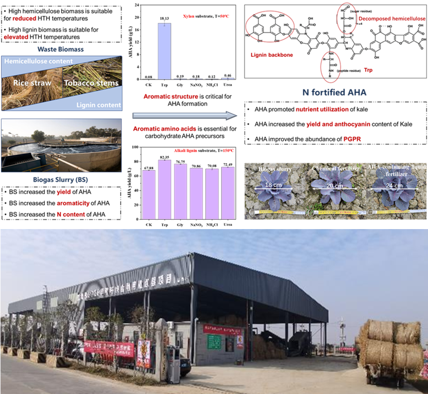团队聚焦核心科学问题,攻克了生物质废弃物腐殖化途径与调控机制不明的难题。通过系统研究,明确了水热腐殖化过程中碱催化的核心作用,以及原料组分对最优温-碱配比的影响规律;揭示了含氮原料通过芳香氨基酸等中间体提升人工腐植酸产率、氮官能团含量与结构稳定性的内在机制,阐明了微生物代谢网络与碱催化-氮强化的协同路径。同时,率先探究了尿素和沼液在化学人工腐殖化中的协同促腐机制,明确其对人工腐植酸化学结构与功能基团的调控作用,为后续技术开发提供了精准的理论依据与调控策略。