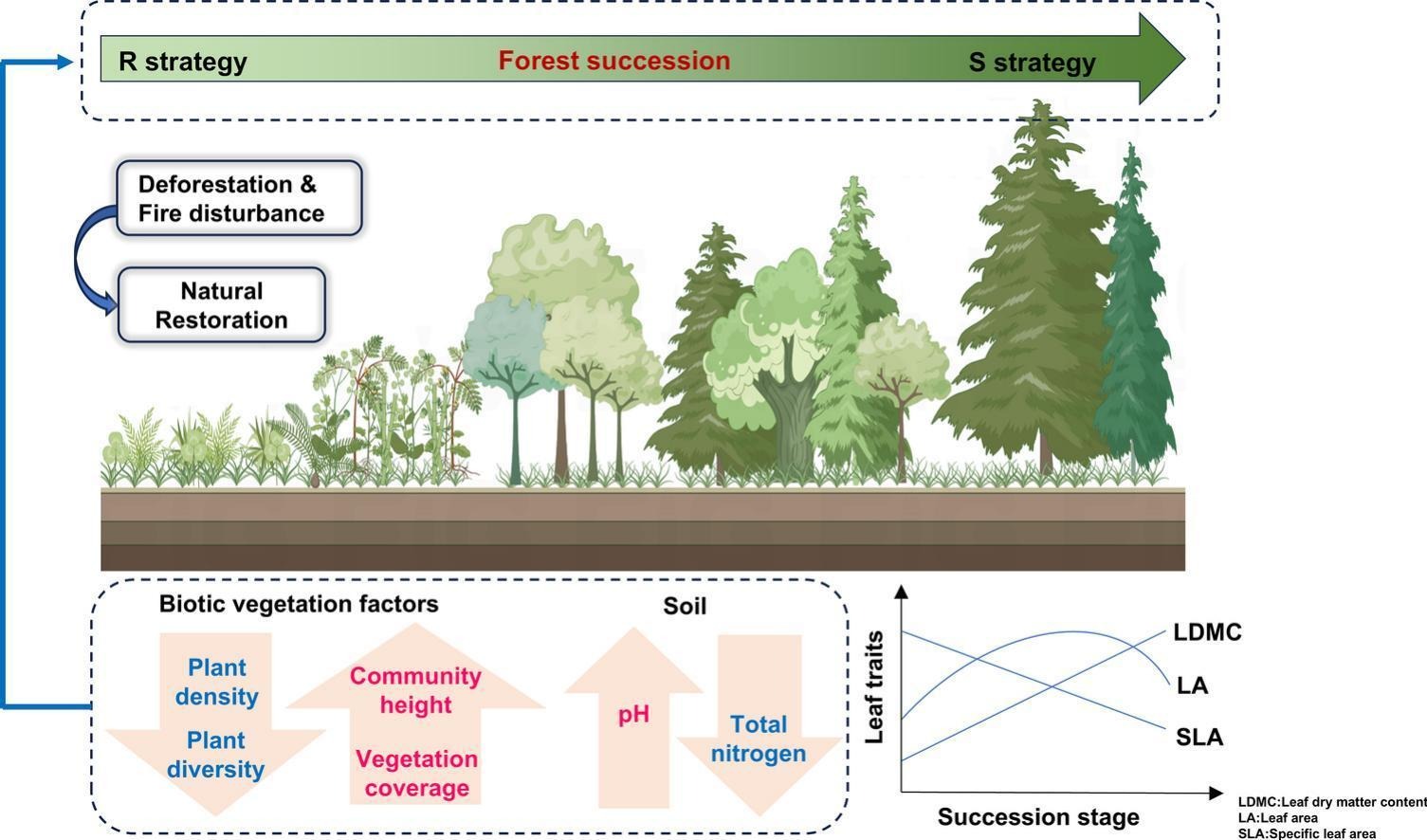 该研究揭示了森林演替中不同林层生态策略变化的复杂性,明确了生物和结构因素在驱动演替过程中的关键地位,揭示了调控植物密度、优化群落空间结构和积极土壤养分管理等措施在促进次生林向稳定阶段恢复的生态机理。