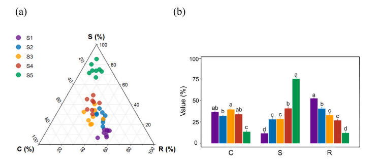 研究发现:(1)亚高山森林群落的整体生态策略沿演替梯度确实发生了从R策略主导向S策略主导的转变,验证了CSR理论的基本框架。(2)然而,不同林层的转变轨迹并不同步,呈现出“异步变化”模式。乔木层的策略转变与整体群落一致;灌木层则呈现C和R策略增加、S策略下降的相反趋势;草本层则保持相对稳定。(3)生物因素(如植物多样性、密度、植被盖度和群落高度)与非生物因素(如土壤全氮和pH)共同驱动着生态策略的演变,其中生物因素的作用更为主导。