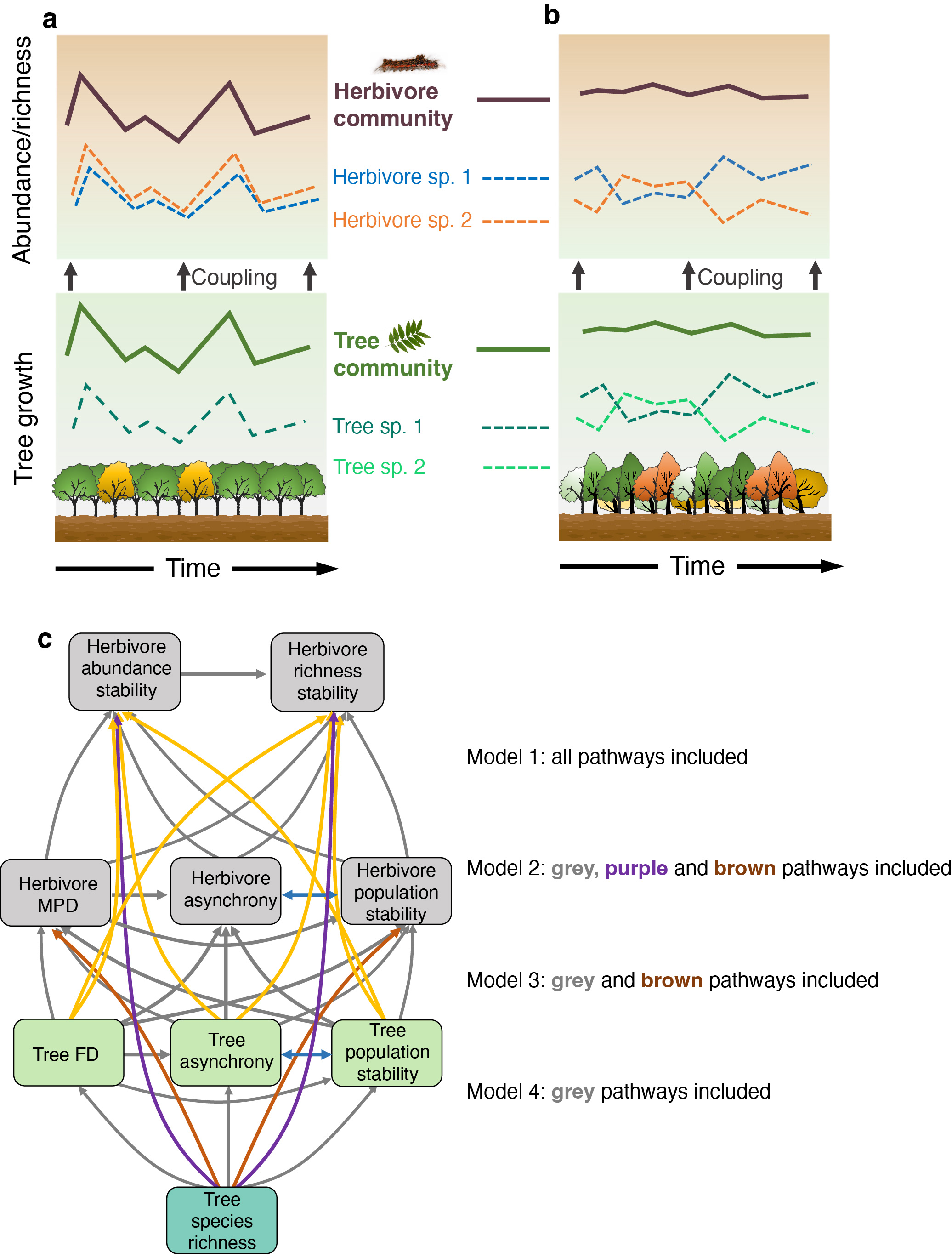 近日,中国科学院成都生物研究所王明强副研究员依托亚热带森林生物多样性与生态系统功能实验平台(BEF-China),联合中国科学院动物研究所朱朝东研究员、中国科学院植物研究所马克平院士、刘晓娟研究员、德国哥廷根大学Andreas Schuldt教授、Georg Albert博士以及多家单位研究人员,系统揭示了树种多样性、树木生长稳定性与植食性昆虫群落稳定性之间的跨营养级耦合机制。相关研究成果以“Asynchrony and functional diversity couple herbivore community dynamics to host plant diversity”为题发表在Nature Communications。研究基于BEF-China实验样地中从单一种植到24种混交的树种多样性梯度,整合了2017—2022年连续6年、17个采样季的鳞翅目幼虫群落数据(共计17,850个个体),并结合树种的功能多样性、生长异步性和种群稳定性等指标,系统解析树种多样性对植食性昆虫群落稳定性的直接与间接作用路径(图1)。主要研究结果表明: