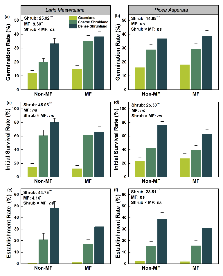 中国科学院成都生物研究所尹春英研究团队向双课题组以川西退化亚高山森林的四川红杉(Larix mastersiana)和云杉(Picea asperata)两种建群树种为研究对象,选取密灌丛、疏灌丛、草地三种演替阶段生境,设置有无微生物肥料的对照实验(所用微生物肥料由黄钧团队利用研究区域凋落物层分离的纤维素降解菌烟曲霉F7制备而成),通过360个微生境的1080粒种子播种试验,系统监测种子萌发、幼苗存活及相关环境因子。