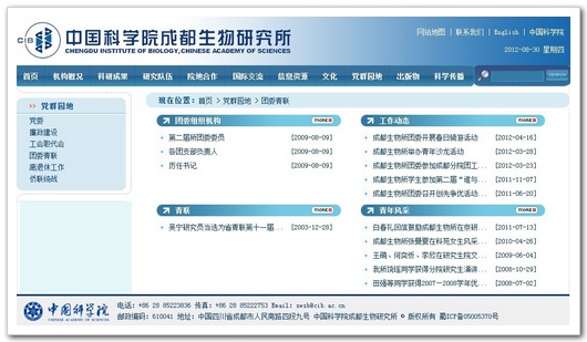 近日,成都生物所团委网站全新改版,并于9月3日正式投入使用。该站的建设得到了综合办公室网络技术、信息宣传等岗位人员的大力支持。