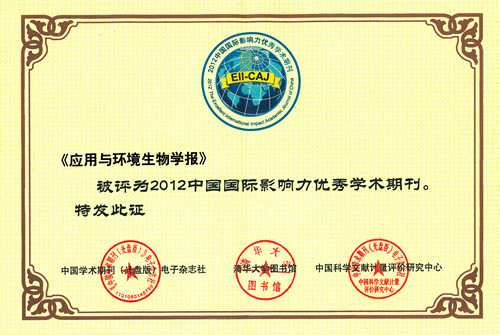 近日,在中国学术期刊(光盘版)电子杂志社、清华大学图书馆和中国科学文献计量评价研究中心有关我国学术期刊国际影响力的共同发布会上,《应用与环境生物学报》获评“2012中国国际影响力优秀学术期刊”。