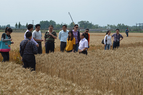 在农业中心研究员吴瑜、王涛及副研究员邓光兵介绍下,考察小组在什邡育种基地考察了小麦育成新品种及新品系的展示情况,对基地的建设和土地合理布局利用进行了研讨;在双流基地,考察小组重点考察了今年新育成小麦品种及其他小麦育种材料的生长情况、农艺性状及预期产量。