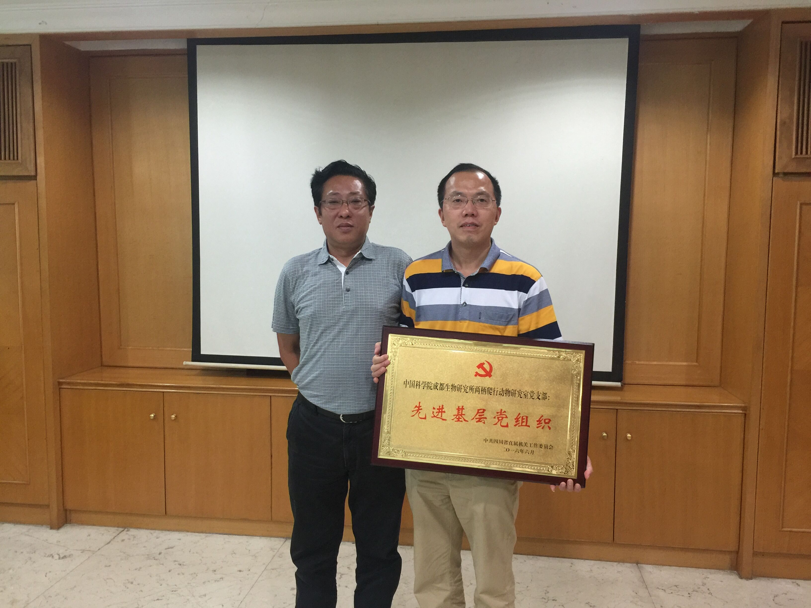 首先,叶彦为获得四川省直机关工委“先进基层党组织”的两栖爬行动物研究室党支部颁发了奖牌。