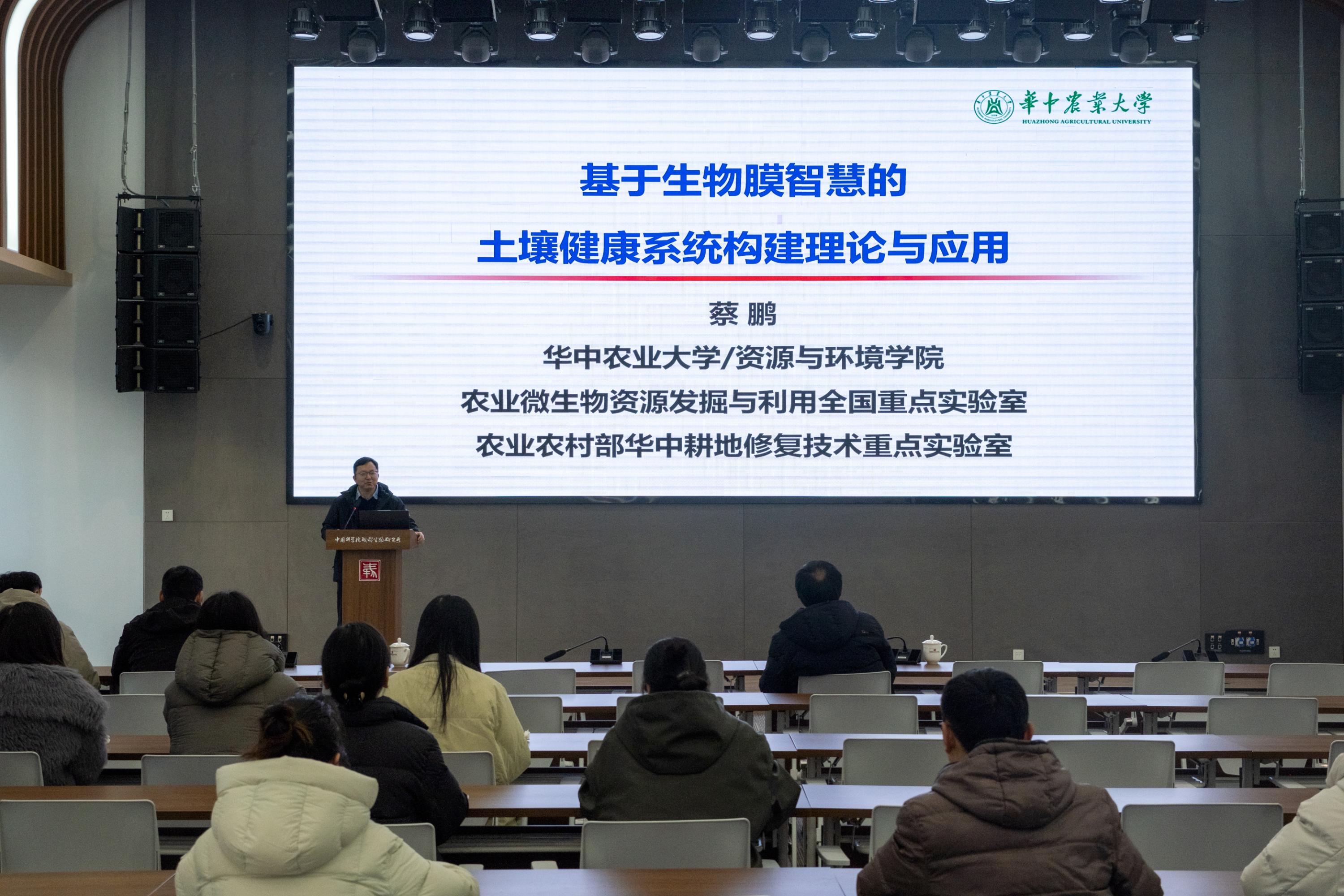 蔡鹏教授作了题为“基于生物膜智慧的土壤健康系统构建理论与应用”的锦江论坛专题学术报告,分享了土地健康与耕地挑战、生物制剂产业化、生物膜与胞外聚合物等方面的新理论与应用前景,系统阐述土壤界面微生物培养、微生物驱动矿物团聚促进有机碳稳定及其物理-化学-生物协同作用等团队最新科研进展。
