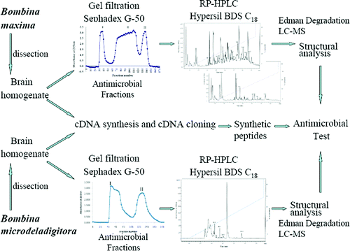 Abstract It is well-known that there is a large amount of antimicrobial peptides in amphibian skins but few antimicrobial peptides are found in amphibian brains. Twenty-two and four antimicrobial peptides were purified and characterized from the brain homogenate of Bombina maxima and B. microdeladigitora, respectively. One hundred fifty-eight cDNA clones encoding 79 antimicrobial peptides were isolated from brain cDNA libraries of B. maxima and B. microdeladigitora. These antimicrobial peptides belong to two peptide groups (maximin and maximin-H). Twenty of them are identical to previously reported antimicrobial peptides (maximin 1−8, 10, 11, maximin H1, 3−5, 7, 9, 10, 12, 15, 16) from B. maxima skin secretions. Fifty-nine of them are novel antimicrobial peptides. Some of these antimicrobial peptides showed strong antimicrobial activities against tested microorganism strains including Gram-positive and -negative bacteria and fungi. The current diversity in peptide coding cDNA sequences is, to our knowledge, the most extreme yet described for any animal brains. The extreme diversity may give rise to interest to prospect the actual functions of antimicrobial peptides in amphibian brains.