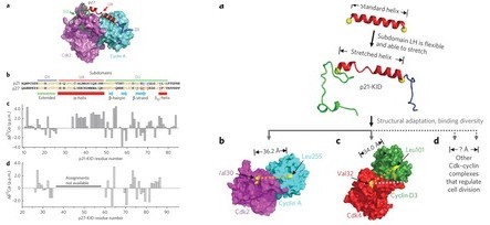 在这篇文章中,陈剑寒等研究人员利用核磁共振分光技术结合生物化学与细胞分析方法,证实p21蛋白的螺旋亚结构域LH可发生结构变化,LH的结构可变性确保了在与Cdk–cyclin复合物结合时,p21的另外两个亚结构域D1和D2能够分别特异性结合在cyclin 和 Cdk亚基保守区域。研究结果表明这种适应性折叠结合有可能对于真核生物中固有无序蛋白的多重生物功能起重要的调控作用。