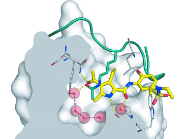 Abstract Bromodomains are acetyllysine epigenetic mark reader proteins. Small molecules inhibiting them have potential as anti-inflammatory, antiviral, and anticancer agents. A 4-acyl pyrrole derivative (see yellow structure in recognition pocket) has been identified that potently inhibits specific bromodomains and exhibits antiproliferative activity against leukemia cell lines.