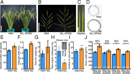 在这项研究中,作者从热带粳稻地方品种发现了一种基因,小穗数目(SPIKE)基因,通过对株型产生多向性作用而提高籼稻品种的谷粒生产能力。图谱克隆表明SPIKE等同于NARROW LEAF1 (NAL1)基因,已报道其控制叶脉模式。一个通用籼稻品种近等基因系IR64和超表达系的表型分析揭示穗粒数、叶面积、根系统和维管束数目都产生了增加,表明源大小、迁移能力以及库大小的增强。近等基因系增产13–36%,而对外观没有任何负面影响。表达分析表明,该基因在所有类型的细胞中都表达:穗、叶、根和茎,证明对植物结构的多向性影响。此外,SPIKE增加最近发布的籼稻品种IRRI146的谷粒产量达18%,也增加其他通用籼稻品种遗传背景的小穗数。水稻育种中SPIKE基因的利用将有助于南亚、东南亚等籼稻种植地区的粮食保障。(编译:中国科学院成都生物研究所 王芋华,王海燕)