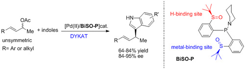 近日,成都生物所廖建研究小组设计了一类新型手性双亚砜膦配体(BiSO-P),并首次通过DYKAT策略实现了钯催化的1,3-二取代非对称烯丙醇酯不对称吲哚化,获得了高区域选择性(85/15-96/4)、高收率(64-84%)和高对映选择性(84-95% ee)的结果。机理研究证明,烯丙基钯中间体快速去消旋化是反应获得高对映选择性的关键;配体的两个亚砜基团在反应过程中扮演不同的角色:Lewis酸(与钯配位)和氢键受体,发挥了双功能的作用。特别是亚砜基团与吲哚底物形成的氢键,不但提高了反应速率,而且能够有效控制立体选择性。