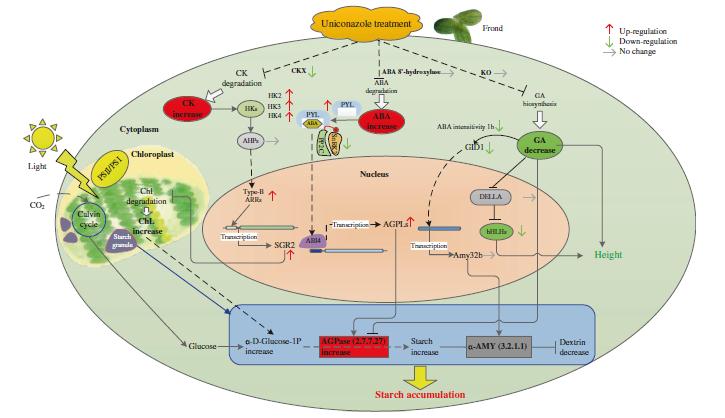 烯效唑引起的内源激素的变化主要是通过以下途径对淀粉的积累发生作用:脱落酸(ABA)含量的增加促进淀粉合成限速酶AGPase基因大量表达,从而促进淀粉的积累;玉米素核苷(ZR)通过抑制叶绿素的降解来提高叶绿素含量,进而提高光合作用及其产物的积累;低含量的赤霉素(GA)抑制淀粉降解关键酶α-淀粉酶的活性。最终在三者的协同调控下实现了淀粉的快速积累。总体而言,即通过增加光合效率增加了碳的来源,同时结合淀粉合成的增加与淀粉降解的较少,最终实现了淀粉的快速积累。